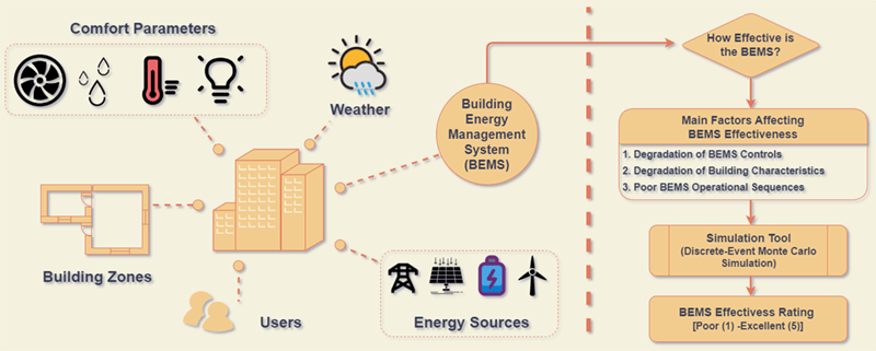 Building Energy Management Systems (BEMS) are computer-based systems that aid in managing, controlling, and monitoring the building technical services and energy consumption by equipment used in the building. The effectiveness of BEMS is dependent upon numerous factors, among which the operational characteristics of the building and the BEMS control parameters also play an essential role. This research develops a user-driven simulation tool where users can input the building parameters and BEMS controls to determine the effectiveness of their BEMS. The simulation tool gives the user the flexibility to understand the potential energy savings by employing specific BEMS control and help in making intelligent decisions. The simulation is developed using Visual Basic Application (VBA) in Microsoft Excel, based on discrete-event Monte Carlo Simulation (MCS). The simulation works by initially calculating the energy required for space cooling and heating based on current building parameters input by the user in the model. Further, during the second simulation, the user selects all the BEMS controls and improved building envelope to determine the energy required for space cooling and heating during that case. The model compares the energy consumption from the first simulation and the second simulation. Then the simulation model will provide the rating of the effectiveness of BEMS on a continuous scale of 1 to 5 (1 being poor effectiveness and 5 being excellent effectiveness of BEMS). This work is intended to facilitate building owner/energy managers to analyze the building energy performance concerning the efficacy of their energy management system.Graphic Abstract